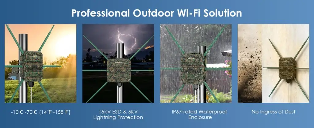 【Designed for Harsh Outdoor Conditions】 IP67 dereceli su geçirmez gövde için tasarlanmıştır. Yıldırım koruması ve weheatproof tasarım, zorlu dış mekan koşullarında istikrarlı bağlantı sağlar. Not: Yönlendiricinin PoE kısmı su geçirmez değildir.